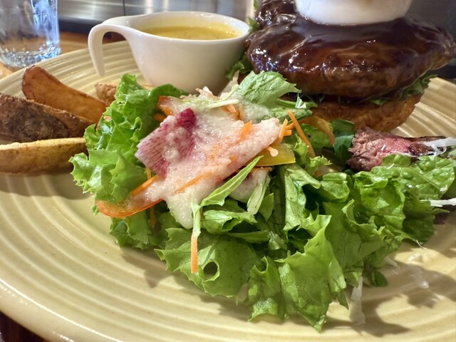 ランチセット♡は、選んだハンバーガーに、+500円 で、日替わりスープとサラダ、フレンチフライに本日の一品♡、そしてドリンクとデザートが付いた、お得な♡ワンプレート・ランチセット♡