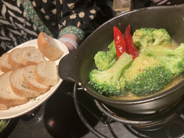 アヒージョはオリーブオイルを柔らかめのバゲットに浸して全て食べ尽くしました笑