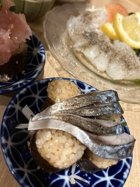 のり巻きの細巻きの上に、しめ鯖が載っている。