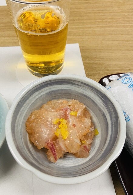 生ビールの鯛刺し明太子和えの小鉢でスタートし