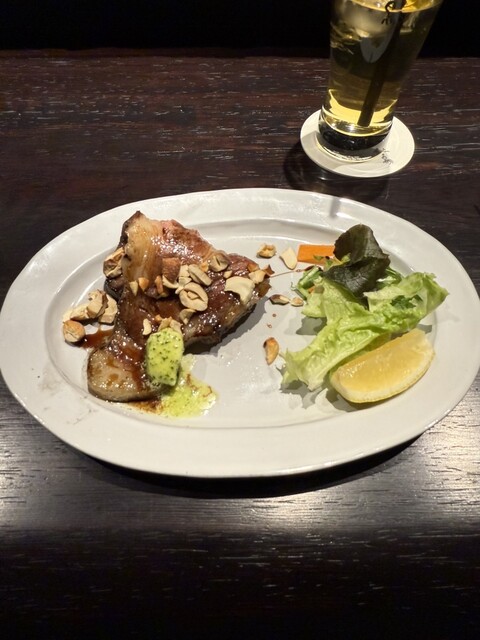大きな炭火焼きにはナッツ、香草のソース。レモンも搾っていただきます。