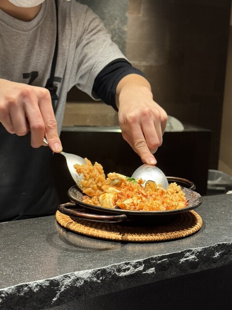 牡蠣とモッツァレラチーズが乗ったパエリアでした。店員さんが混ぜ合わせて取り分けてくれます。