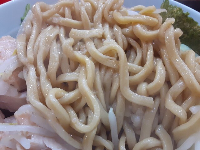 混ぜ合わせるために天地返ししたら、二郎さんを思わせるような麺が現れました。その麺をすするとからんだタレが、あ、甘い!というかすき焼き風な感じでしたね。これはオモローですが、ラーメンもそうなんかしら..