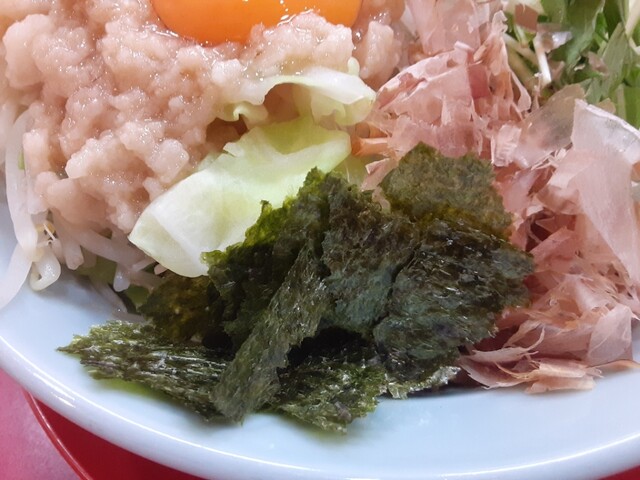 デフォのヤサイの上にはコールしたアブラ、その上に卵黄が載ってます。
