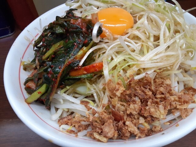 小ラーメンの汁なし、ネギ、ニラキムチでコールはそのまま。麺量はいじらなかったのですが、ちょうど良い量でした。たまたま前には女性3人で、半分、半分、少なめだったのでちょいと心配でしたが(汗)