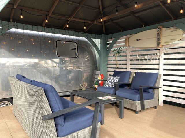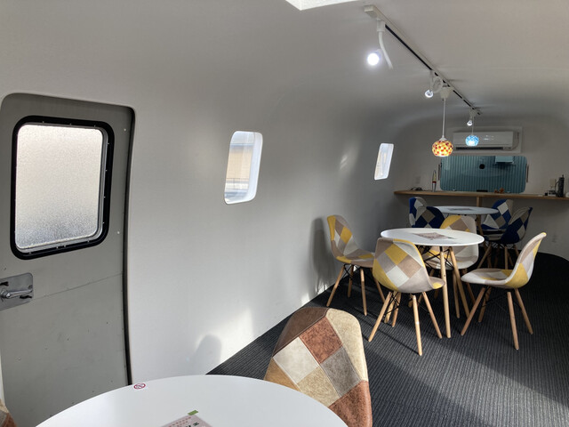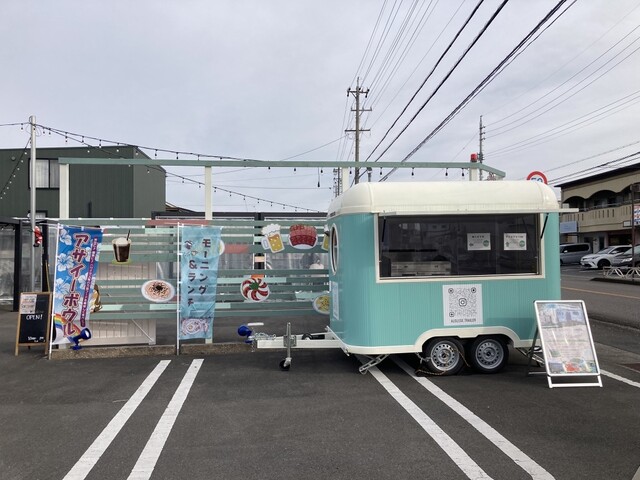 お店のキッチンはトレーラー内にありテーブルはトレーラー内の席やテラス席があってとても雰囲気があります