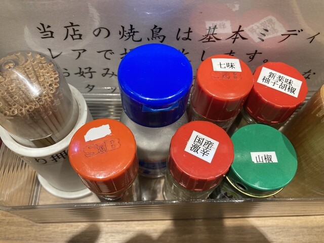 焼き鳥の調味料も塩・一味・七味・山椒・激辛粉・柚子胡椒粉末と充実していて色々と試しました♪