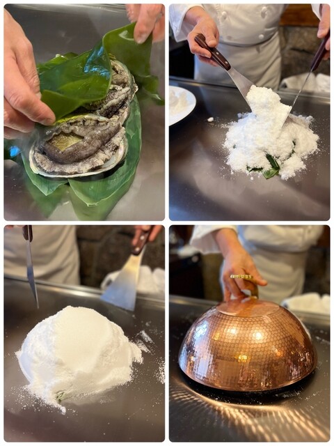 鮑の岩塩蒸しの調理を始めます。