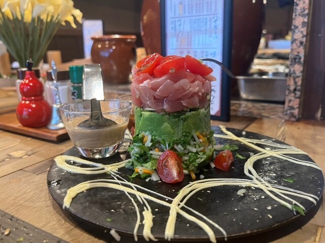 マグロとアボカドのタルタルを、 ミニトマトと刻んだレタス、ニンジン、大根、セロリなどと サンドしてあります♪(๑˃̵ᴗ˂̵)