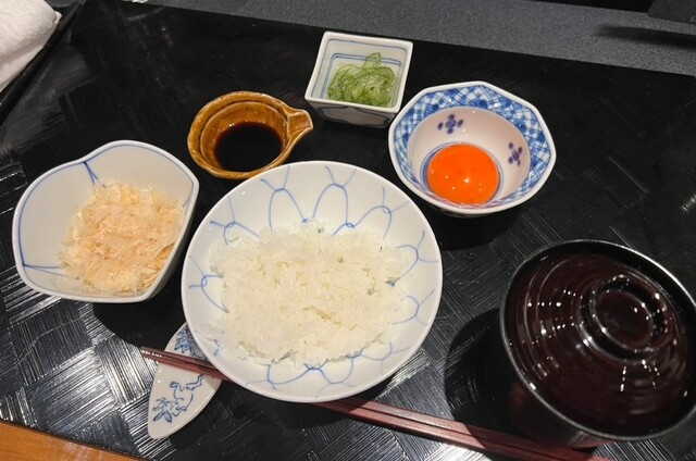 ◯卵かけご飯セット …とりと、自家製だし醤油、大分蘭王というブランド卵。私はお揚げと三つ葉のお吸い物です。