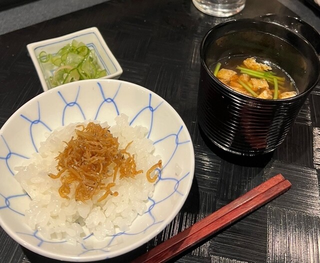 ◯じゃこご飯とお味噌汁…魚沼産コシヒカリの新米。 香りも良く‥粒が立ってる白いご飯! 自家製のちりめん山椒といただきます♪