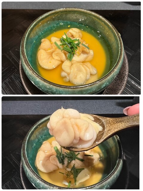 ◯焼き白子の茶碗蒸し ‥北海道産真鱈の白子(クモコ) 柚子香る餡かけは、優しい甘さで鰹出汁の風味もふわっと♪