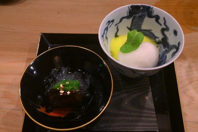 21.葛切 黒蜜がけ 黒糖のゼリー えんどう豆の餡
