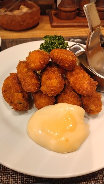 お店のインスタグラムで今シーズンのカキフライが始まったとの投稿を見たので、早々に訪問してきましたw。カキフライの単品とランチセット(スープとライス)をオーダー。ちょうど1年ぶりのカキフライは、米俵の様に積み重なったグリル末松独特のフォルムで、見ているだけで幸せになれますw。目の細かいパン粉の衣を絶妙の薄さで纏って、カキの旨味やエキスを一滴も漏らさず閉じ込めているのは、本当にすごい技術だと思います。カキのサイズは小ぶりですが、上品かつ力強いカキの旨味が口の中に広がり、シーズン直後とは思えない美味しさでした。
