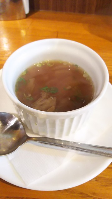 ハンバーグの空気を抜くパチパチという音、油の跳ねる音を聞いているだけで、美しい調理場で美しい料理が出来上がっている事が容易に想像できます。相変わらず極旨の和牛スープを堪能して、メインのハンバーグ&シーフードクリームコロッケの登場。このコロッケ、2つに咲いた海老が土台になっていて、その上にシーフードのクリームソースが詰まってるという代物。ナイフを入れるとクリーム部分はスッと入って、最後に海老の身の手ごたえが(笑)。コロッケ、ハンバーグ共々、美味しいソースと共に、心行くまで堪能させて頂きました。店主、奥さんの人柄も加わって、お店の雰囲気も良いですし、平日だと月・火しかタイミングが合わないですが、何度も訪れたくなるお店です。