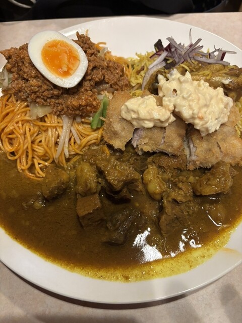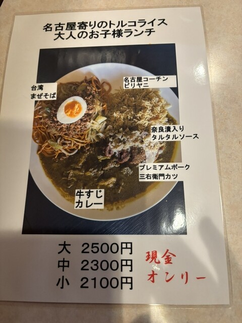 X告知を見たからには例え新橋だろうと達磨信者は伺わない訳にはいかない。狭い路地に入りお目当てのお店を発見。本店通りの作法で先ず記帳して女将の案内を行儀良く待ちます。オーダーは大人のお子様ランチ大¥2500をオーダー。ワンプレートに名古屋コーチンビリヤニ、具たっぷり牛すじカレー、台湾まぜそば、しば漬けタルタルのせとんかつが所狭しとひしめき合います。中川本店では何度も頂いていますが、フェス状態で頂くのは初めてです。定番メニューをいっぺんに少しづつ(決して少しではないが)楽しめて大満足大満腹です。再度の東京開催を懇願して(女将もまたやると快諾)退店しました。ご馳走様でした。