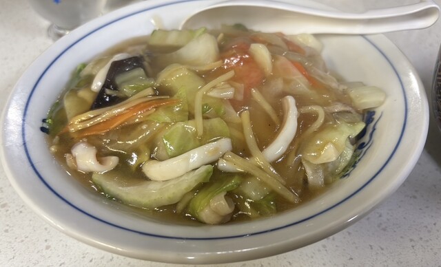 濃厚餡かけの中に、カニカマと角切り肉がレンゲを止まらせない。