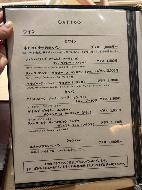 飲みものは、色々飲みたい私は、生ビール、グラス赤ワインBOURGOGNE(ブルゴーニュ産)グラス白ワインURLAR(ニュージーランド産)而今をいただきました。お酒を楽しむ方も存分に楽しめるメニューが用意されており、ホスピタリティにも溢れ、お腹も心も満たされて特別で幸せな時間をすごせました。