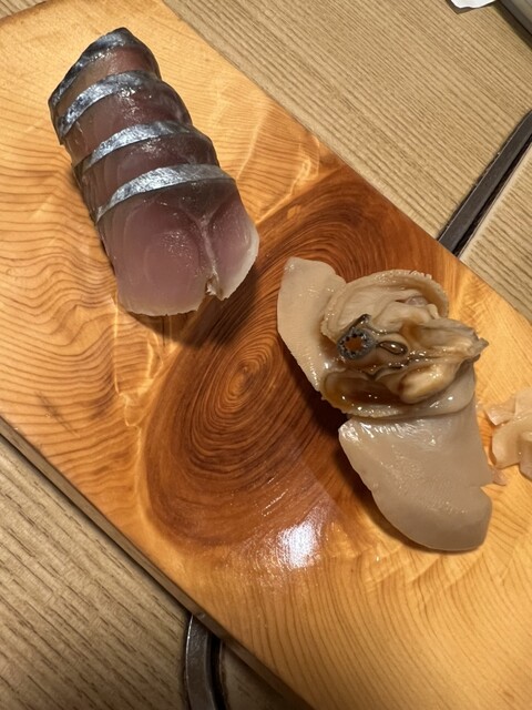 三連休の中日に滋賀県長浜市の京極寿司に伺いました。2週間前に予約を入れましたが、カウンター席は取れず小上がりのテーブル席でした。あん肝ポン酢、煮穴子、イカゲソ焼きをおつまみでオーダーして、寿司は名物のバッテラ鯖の巻き寿司と琵琶鱒、そして、にぎりを鰤、金目鯛、えんがわ、香箱蟹軍艦など頂きました。