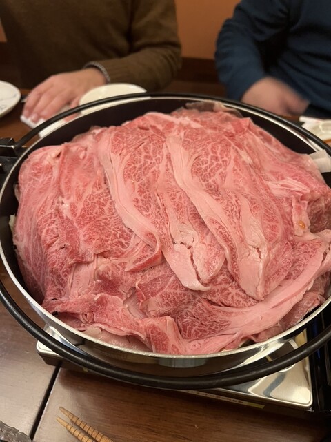 なかなかこれだけの厚みの刺身を食べたことがありません。鍋の牛肉のボリュームもすごかった。
