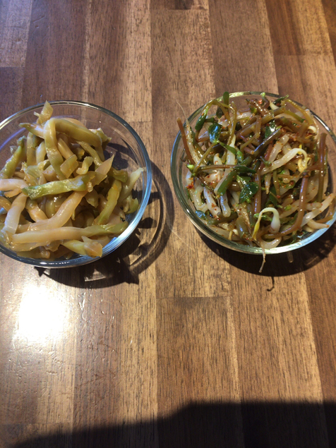 また、セルフ小鉢もあり、この日はザーサイと水菜のサラダなどでした。