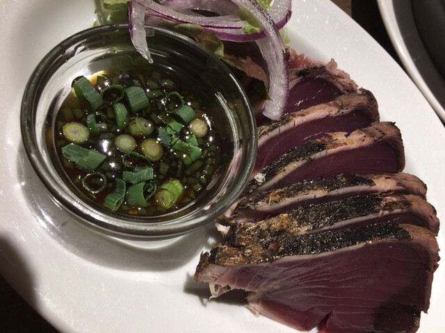鰹のたたきは、特製山椒ポン酢ソースでいただきます。