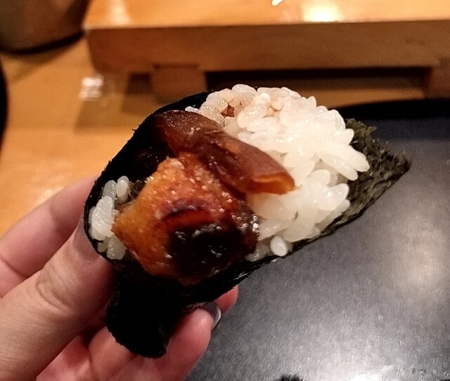 握りは赤酢の色がしっかりついた、もはや赤というより黒目のとがったシャリ。