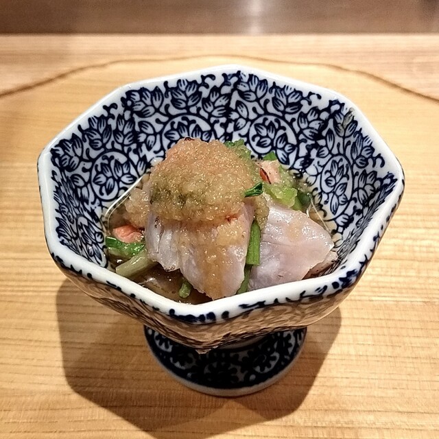 金目鯛とせりのおろしポン酢和えは、さっぱりとしつつもお酒が進む味付けでした。