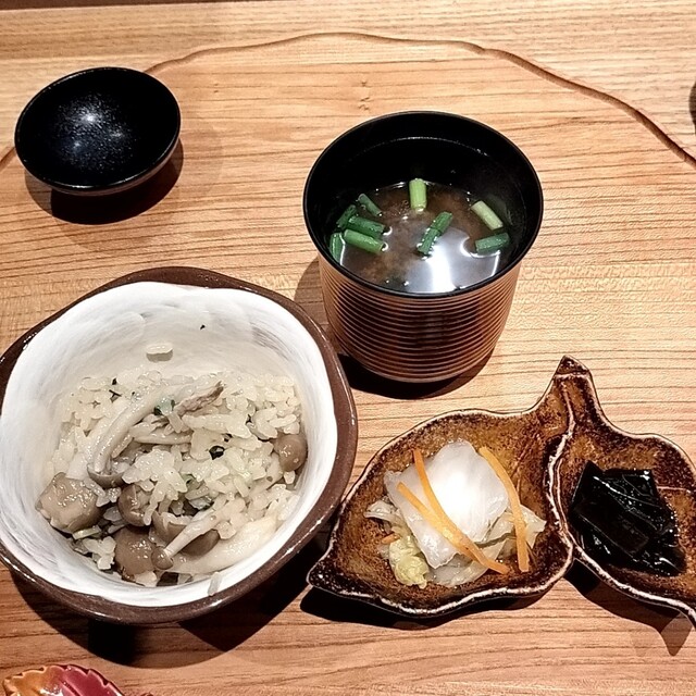 ◯秋鮭といくらの炊き込みご飯 赤出汁と漬物