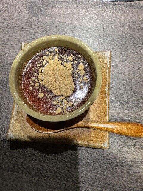 最後に丸福プリンきな粉と黒蜜がかかったものをいただきます、プリンの味が無に近い感じでそこに蜜ときな粉を混ぜ合わせると丁度いい塩梅になります。