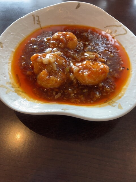 メインの大海老のチリソースは一口では食べきれない大きさでボリューム満点!