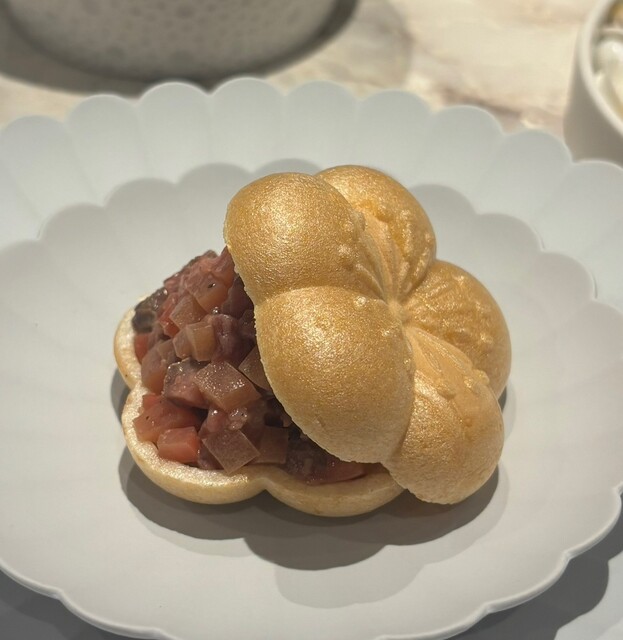 梅のもなかに挟まれた、やわらかな和牛と梅漬けたくあんの食感の対比も楽しい。