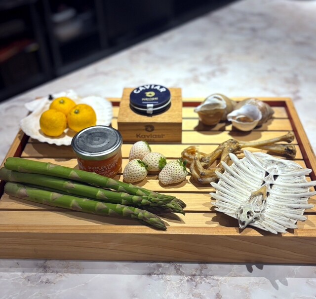 紅はっさくサラダ、ホワイトアスパラの上にはフランスのキャビア。