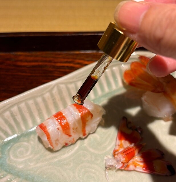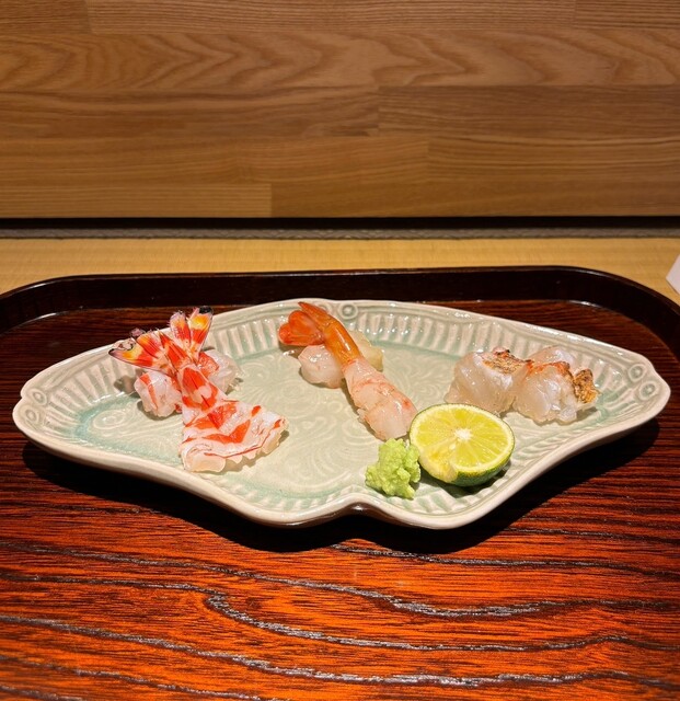 昆布締め甘エビ、蟹味噌で和えた渡り蟹、雲丹を香り高い有明海苔で巻いて。