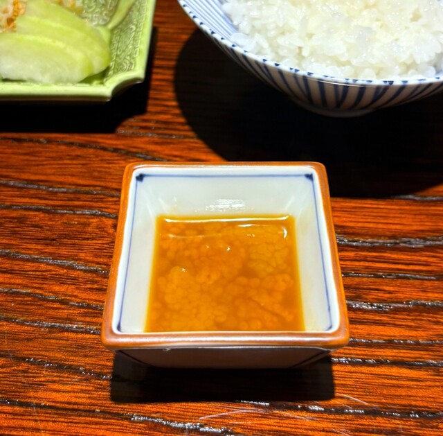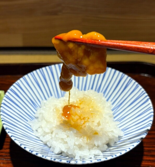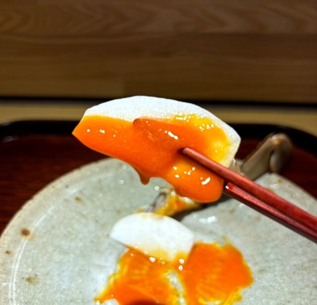渡り蟹の卵の醤油漬けをお箸で摘んでご飯にのせると、究極のたまごご飯に。
