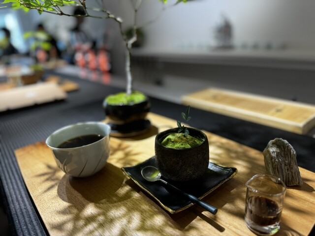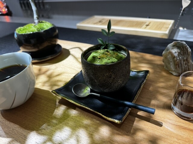 オーナーのこだわりの空間で全てにおいて計算されたお店です。盆栽は山形県の盆栽業者から定期的に入れ替えてオーナー自身も盆栽や苔にも詳しく色々教えて頂きました。器もコーヒーでもお茶でも美味しく頂けるようにオリジナルで作ってもらった器で頂きました。盆栽プリンも滑らか系のプリンで見た目、美味しさも良いです。カウンター席は席料¥100掛かりますが色々話しも聞けて¥100は妥当な金額です。ゴールデンウィーク中で混んでましたが、次回は平日のコーヒータイムに伺いたいと思います。