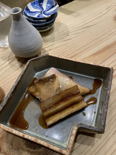 “真似鰹とウドの煮付け。魚の煮付けって結構な時間かけてコトコトと煮て味を染み込ませる印象ですが…。ここはささっと身を捌いて煮込み時間は10分前後!身の中まで味を染み込ませないんです。う〜ん、新しい!