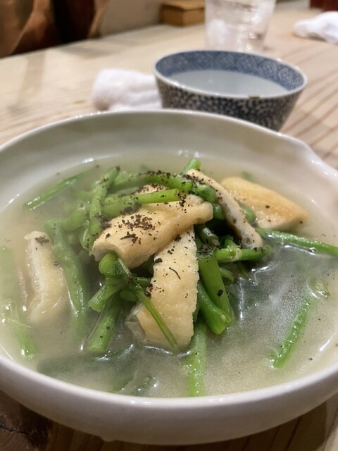 いつも思いますが、高価で手に入らない食材を基に作られた料理はそれだけで存在感があり、素晴らしいとは思いますが、こちら“食堂 おがわ”では高級食材ばかりとも限らず、その証拠に本日の一皿目は“芹とお揚げ”。シンプルで誰もが食した事のありそうな一品。しかし、小川氏の手に掛かれば味わい深く、ジワッと旨さが口の中に広がって季節感を強く感じるものとなります。
