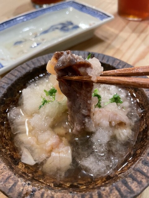 お皿に盛り付けるとこんな感じです。“河豚のタタキ”!初めて食するかも…。河豚の風味と食感、旨みがジワッと出ています。