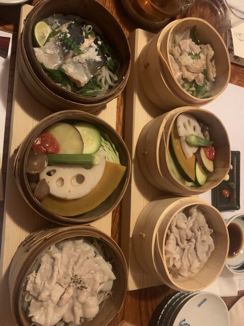 全種類食べたかったので、牛肉、鶏肉、お魚としました。豚肉、野菜は全て同じで、メインの1品とで目の前に3個並びます。ポン酢は写真撮りませんでしたが、野菜にはお塩など、色々なつけダレで楽しみました。ご飯もちょうどいい塩加減のおにぎり2個がせいろ蒸しに入ってホカホカして美味しかったです。デザートはアイスが抹茶かバニラを選べるまして、追加で抹茶のパンナコッタと虎のモナカを食べました。宇治茶を全面に出しておられるお店で、ドリンクもお茶ならではのメニューで煎茶から抹茶と色々あり父と息子は、ほうじ茶を選びました。娘は煎茶が苦手なのでお水、私はモチのロンのお酒を選びました。なので、抹茶のパンナコッタも抹茶が美味しかったです。お店の雰囲気も女性の定員さんでほっこりとしてて優しいお店です。全てに5をつけてもよかったぐらいのお店でした。京都観光にこられた時は是非お立ち寄り下さいなんちゃって