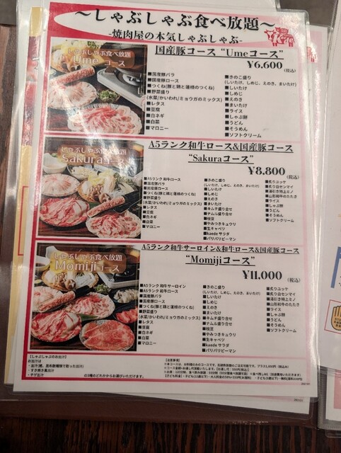 今回は国産豚コース umeコース(6600円)をオーダーした。食べ放題の内容は下記に記載..