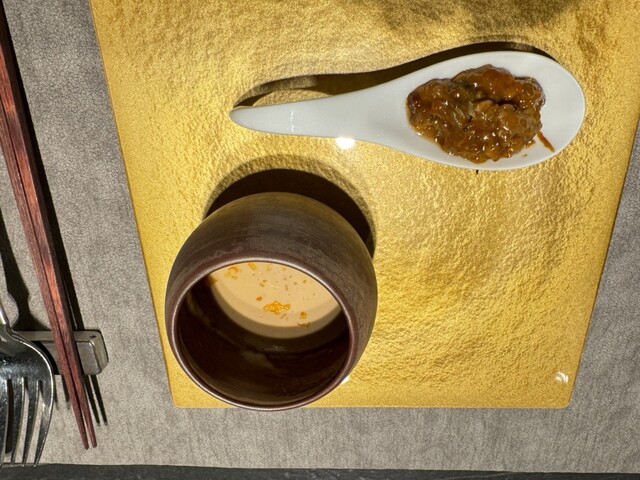 上海ガニやツキノワグマ、ナポレオンフィッシュの素材を生かしつつ、しっかりとした味のお料理もお見事でしたが、フォアグラの上に解したブンタンを乗せたタルトが気に入りました。お話しお聞くと、柑橘類の使い方に気を配っておられるようで、関心しました。