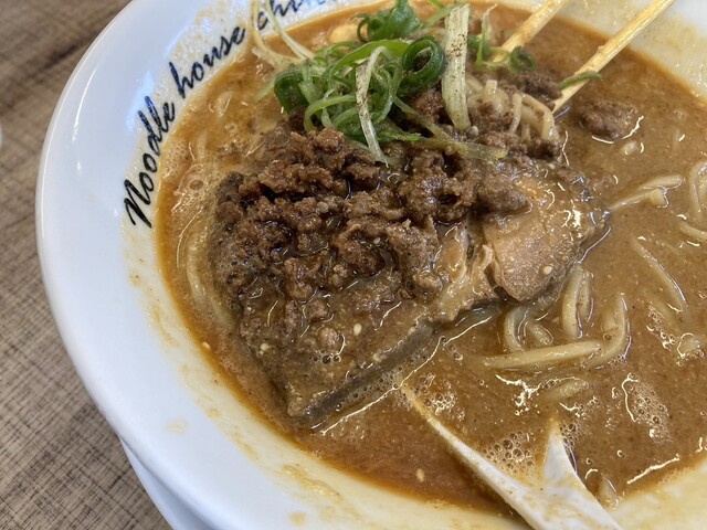 先ずすするスープは…… 旨い………。 なんだこれ? ネギのシャキシャキ感も有りながらのしっとり麺。で、またこの麺が抜群に味が有る。 チャーシューはホロホロ、大きなロース2枚にバラ1枚で味染々の口で溶けるヤツ。 担々麺の方にも分厚いのが入ってて、その上の挽き肉プラスにカシューナッツなんかも入ってて、この担々麺も癖になるヤツなんだよなぁ~