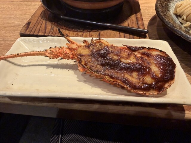 まずは熱々のつけ汁、つけ麺、そして伊勢海老と運ばれてきます。つけ麺の具材には低温調理したチャーシュー、普通のチャーシュー、揚げごぼう、三つ葉、そしてメインの伊勢海老と豪華な見た目です。まずはつけ麺を汁に浸けてパクり!、海老味噌の甘さと味噌の塩味が混ざり、太麺にも良く絡み、クリーミーな味わいです。伊勢海老は上面に味噌を塗って焼いたような感じで、身の甘さと味噌が良く合います。ただ身の部分が上手く取れず、思ったよりも食べ応えが無いのが残念なところ!、次は普通に伊勢海老無しのつけ麺をガッツリ食べたい気がしました。