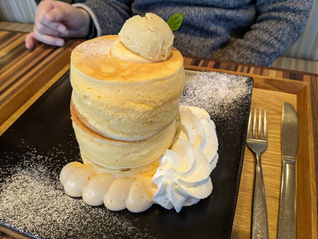 この手のパンケーキは私、初めて食べたんですが、すごいふわっふわなんですね(´∀`)びっくりしました!