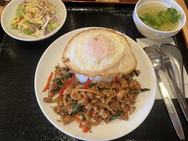 ガパオライス1300円。タイ料理屋さんの中ではそんに辛くないガパオライスであった。様々なメニューがあったため、何にするか迷った。ランチは一律1300円。メインとミニサラダとミニスープ、デザートがついている。量から考えると少しコスパは悪めと感じた。カタコトの日本語ではあったが店員さんの接客とサービスはとても気持ち良くランチを食べることができた。