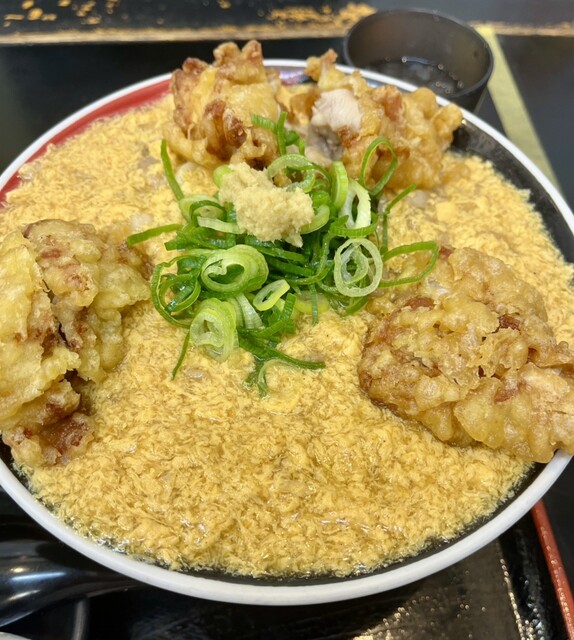 JR玉造駅から徒歩約1-2分の所にあるうどん屋さん。3年連続で大晦日の年越しうどんでお邪魔しています。12時35分に到着。外待ち2人で、用紙に名前を書いて待つのですが、15分くらいで入店出来ました。今までは、”鶏天ぶっかけ”しか注文していませんでしたが、今回は名物の鶏天鶏卵カレーうどん1290円を注文。中盛り無料のため、中盛りに。鶏卵カレーうどんは、上層にあんかけ卵とじ、中層にうどん、下層に濃いカレーの3層構造になっており、良くかき混ぜて頂きます。麺は、ぶっかけの時ほど剛麺ではありませんが、コシがあります。その麺に、スパイスが効いたカレーにあんかけ卵とじが絡まった汁が合わさってかなりの美味しさ。体も温まります。鶏天も大きく、熱々ジューシーで、肉汁で舌が火傷しそうになります。やはりうまい!大満足の年越しうどんでした。