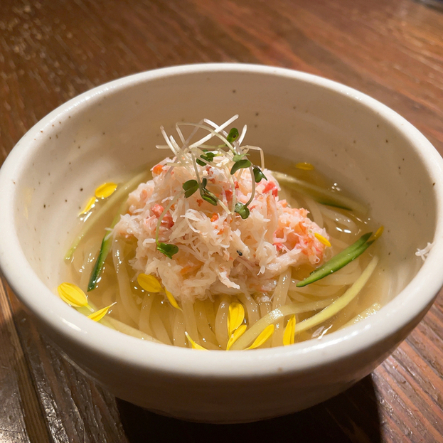 〆にタラバガニの冷麺や西尾の抹茶入りプリンもあるコースで大満足でした(๑><๑)