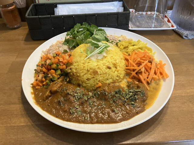 今日はチキンカレーと大好きなエビスープカレーの2盛りに副菜全部とパクチー乗せで優勝!