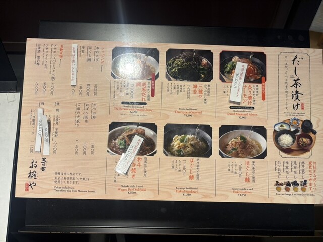 こちらのお出汁は利用してましたが、併設されたお茶漬けやさんがあるのは気づいておらず。たまたま東京駅で晩御飯探してたときにこちらにいきました。待つ場所が分かりづらいのは、改善の余地ありかとおもいます。事前お会計で着席。鯛茶漬けをいただきましたが、とても胡麻が効いていて美味しかったです。他のメニューもまた食べてみたいと思いました。